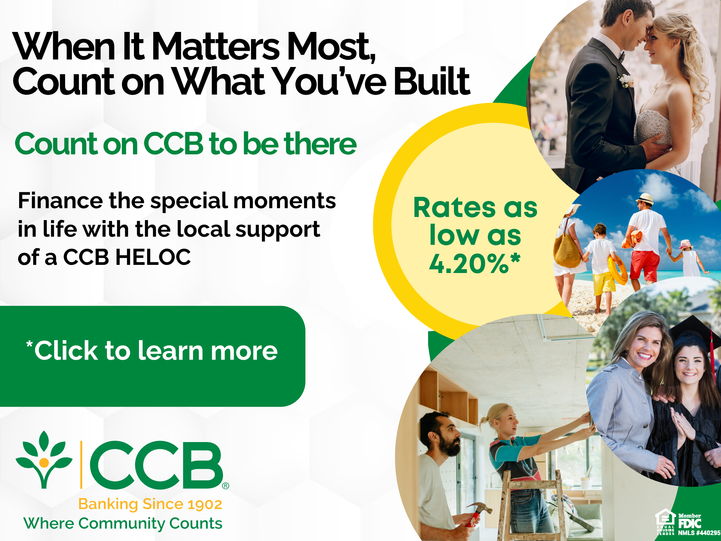 CCB offers checking and savings accounts, personal loans, mortgages, home equity loans, and more – easily managed in branch, on-line, or in-app so you spend less time banking and more time enjoying. Plus, local approvals mean faster approvals on loans and mortgages.
