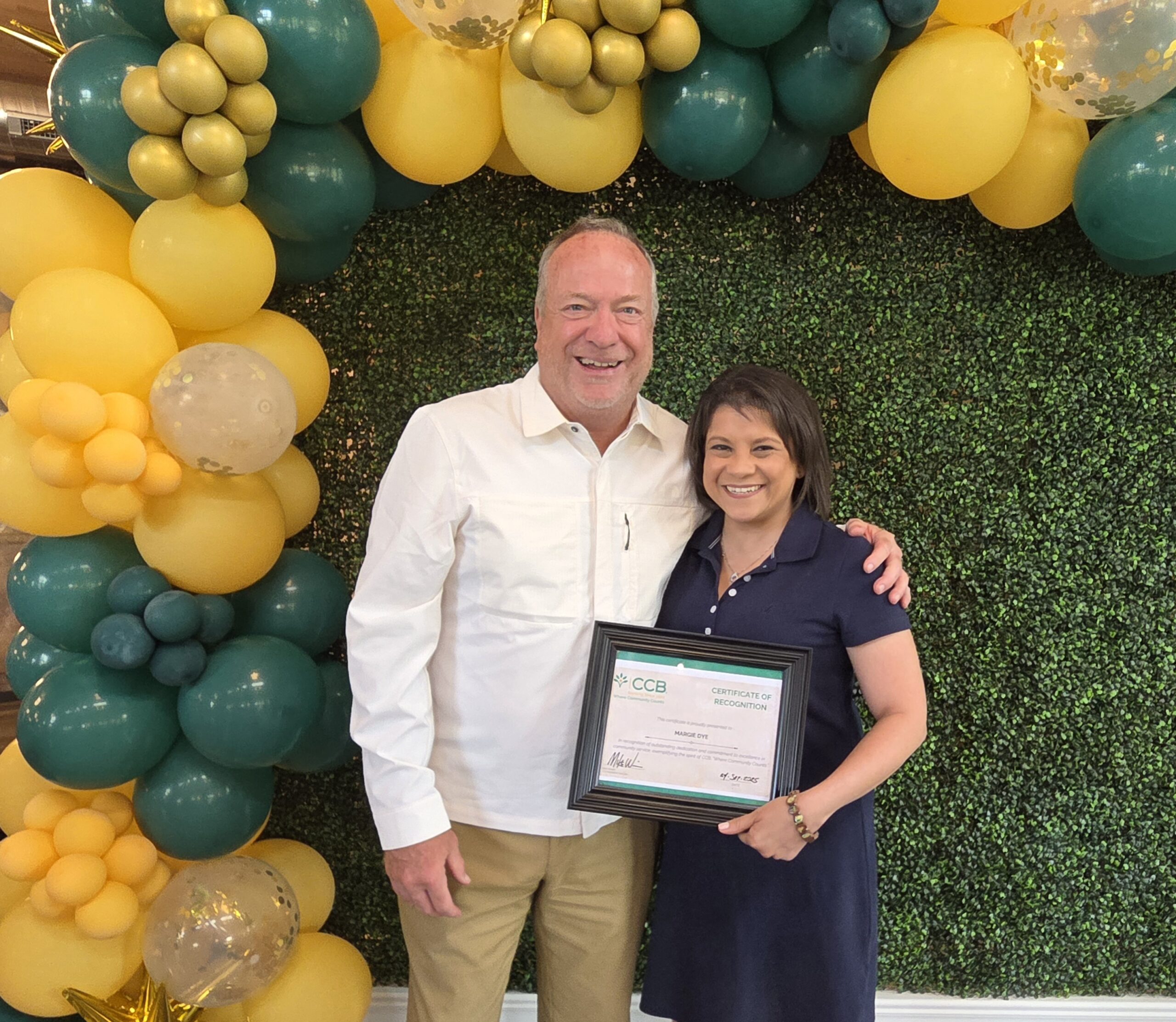 “Margie’s contributions across so many community organizations reflect precisely what makes CCB unique,” said Mike Wimer, President & CEO of CCB. “Her service, her leadership, and her unhesitating readiness to help wherever needed make her a perfect choice for this award. The Spirit of CCB Community Service Award is meant to honor employees whose personal commitment to service reinforces that heritage. We are honored to recognize her with this well-deserved distinction.”
